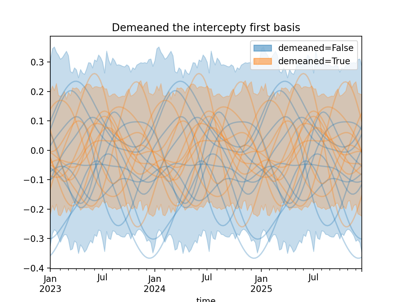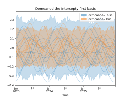 import numpy as np import pandas as pd import xarray as xr import matplotlib.pyplot as plt from pymc_marketing.mmm import HSGPPeriodic from pymc_marketing.plot import plot_curve seed = sum(map(ord, "Periodic GP")) rng = np.random.default_rng(seed) scale = 0.25 ls = 1 kwargs = dict(ls=ls, scale=scale, period=52, cov_func="periodic", dims="time", m=20) n = 52 * 3 dates = pd.date_range("2023-01-01", periods=n, freq="W-MON") X = np.arange(n) coords = {"time": dates} hsgp = HSGPPeriodic(demeaned_basis=False, **kwargs).register_data(X) hsgp_demeaned = HSGPPeriodic(demeaned_basis=True, **kwargs).register_data(X) def sample_curve(hsgp): return hsgp.sample_prior(coords=coords, random_seed=rng)["f"] non_demeaned = sample_curve(hsgp).rename("False") demeaned = sample_curve(hsgp_demeaned).rename("True") combined = xr.merge([non_demeaned, demeaned]).to_array("demeaned") _, axes = combined.pipe(plot_curve, "time", same_axes=True) axes[0].set(title="Demeaned the intercepty first basis") plt.show()