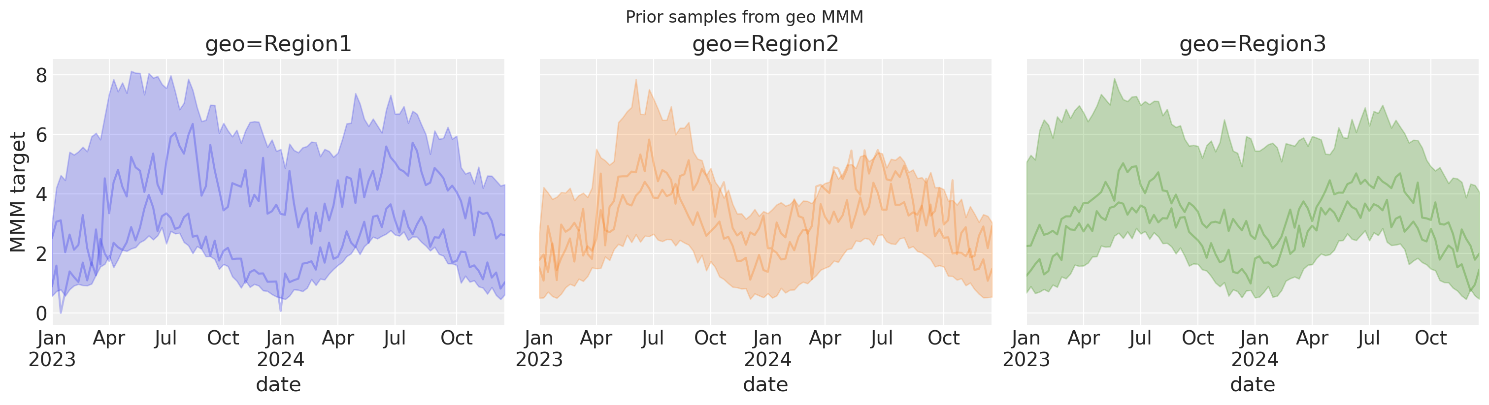 inference_library_version: 5.25.1We will use the plot_curve helper function to plot the target variable across time for each region. This shows the HDI and 2 prior samples for each of the 3 time series.