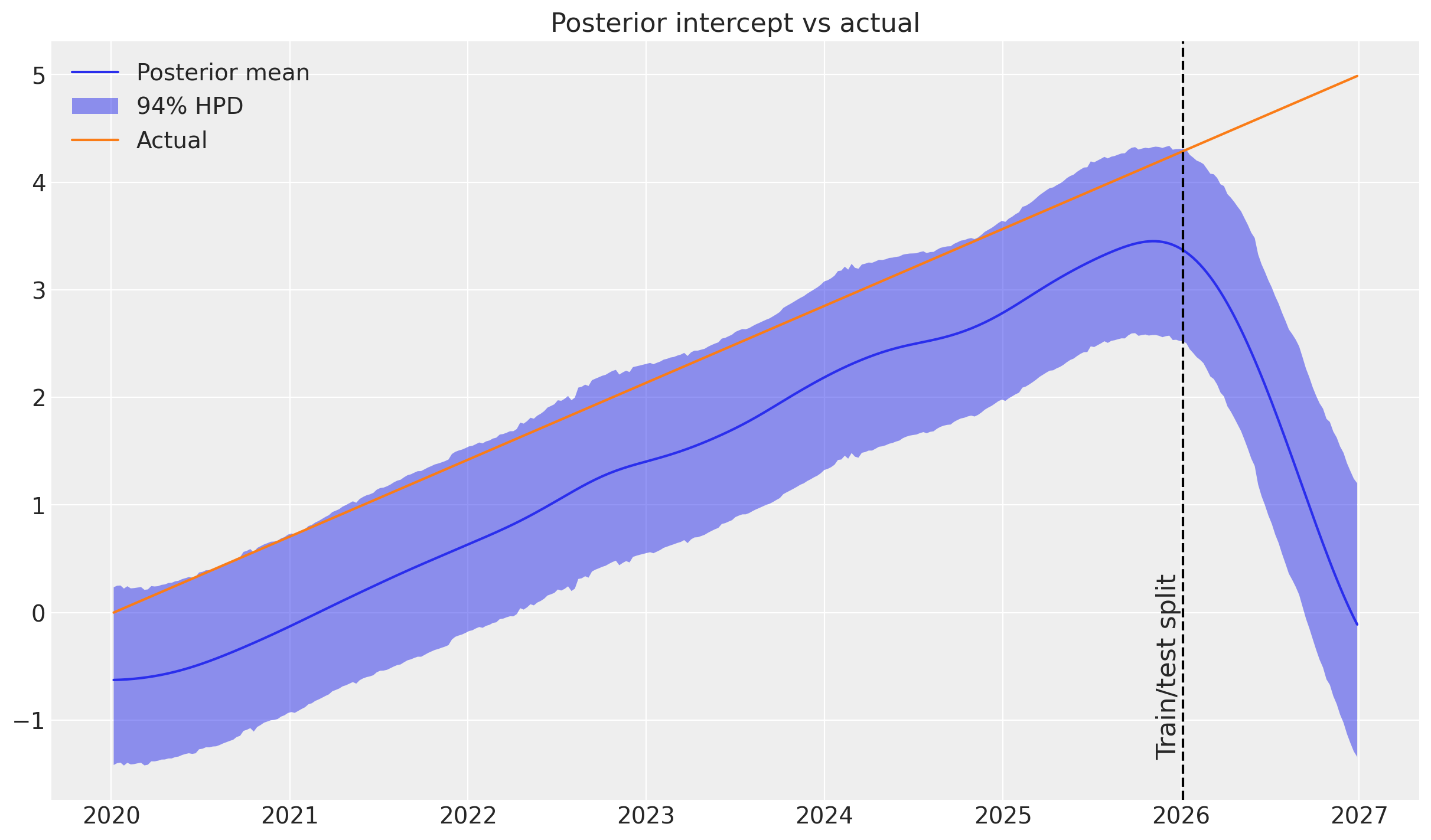 Yearly seasonality: The intercept is a cosine function with a period of one year. Normally, one would use a Fourier basis to model seasonality, but let’s see what happens when we use a time-varying intercept 🤷♂️.